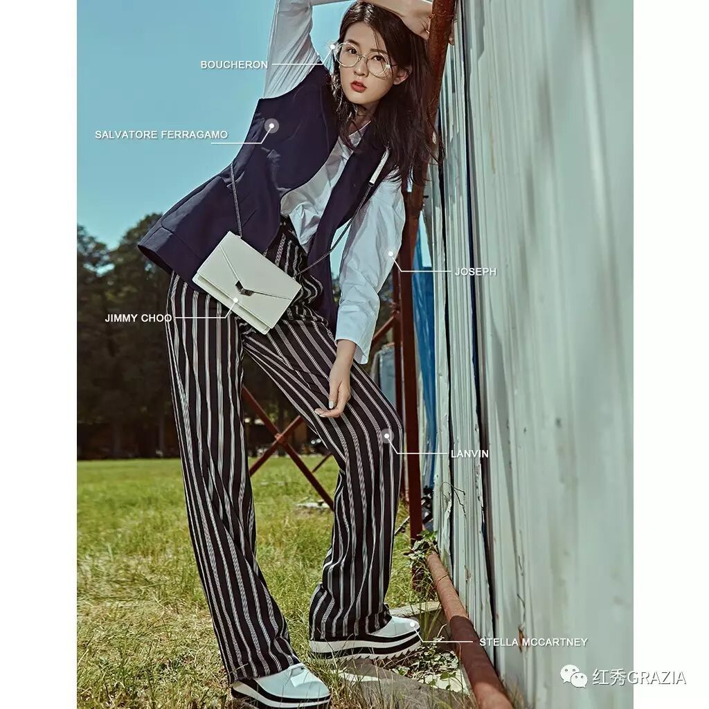 简约白衬衫和干练马甲,搭配潇洒阔腿条纹裤和厚底鞋,这般帅气有态度的乔欣可是不常见!银框眼镜的加持非但没有书卷气,反而更让我们乔欣有了几丝摩登精英式的气场。