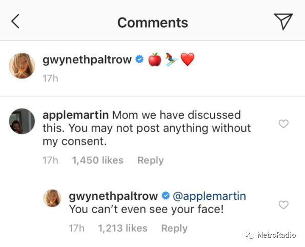 近日,Gwyneth Paltrow在自己的INS上Po了一张跟女儿Apple Martin的合影,被自己的女儿在评论区“抱怨”:“妈妈我们讨论过的,没有我的允许不可以发布与我有关的内容”。这条评论引起了众多"妈妈网友"的不满,甚至有网友表示这种评论很不恰当甚至有些不讲理,最终促使Apple删掉了自己的留言。