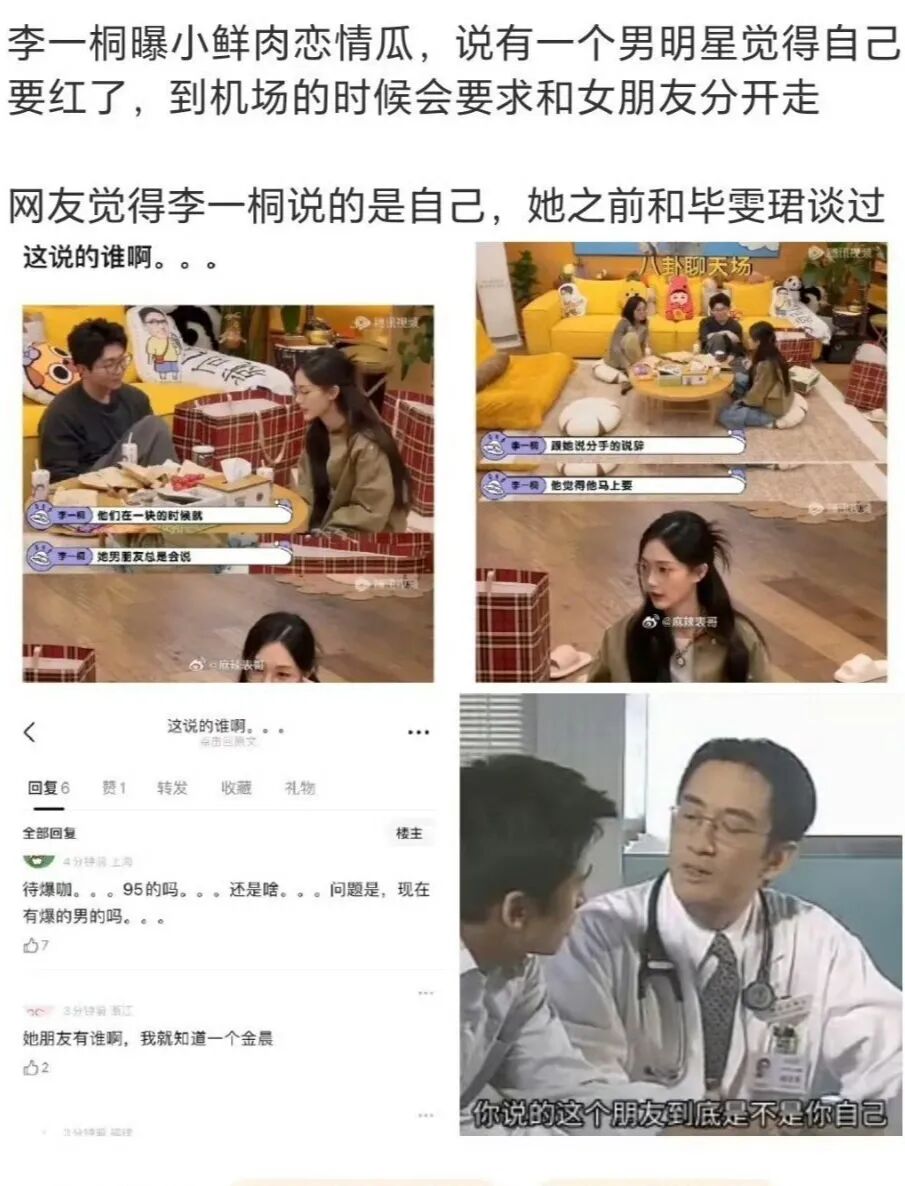 李一桐在毛不易李雪琴综艺上,爆料自己的一位女生朋友,跟圈内男明星谈恋爱,因男明星觉得自己要爆了,所以对自己的私生活总是很小心,甚至还要跟女朋友分手,吃瓜群众猜这个男明星是谁?