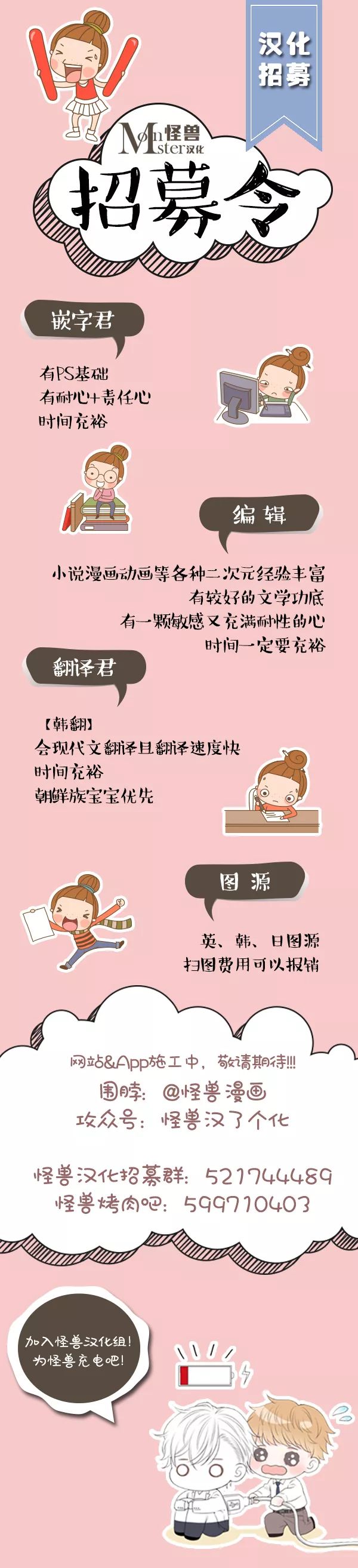 怪兽温馨提醒:带有怪兽汉化标志的漫画除了网站怪兽漫画、微博@怪兽漫画、微信怪兽汉了个化、百度怪兽汉化吧,其他平台都不是我们发的,大家控制好自己的麒麟臂,也希望多多支持原著作者大大!希望大家奔走相告!