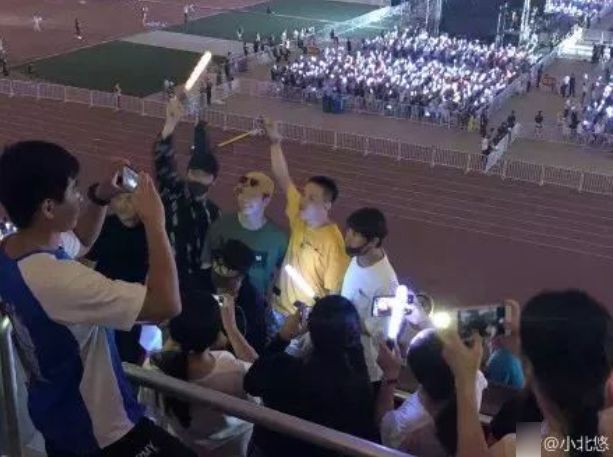 演唱会开场前他们手拿荧光棒为张杰加油。