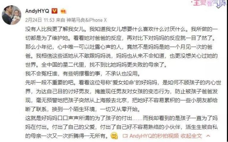 一个真正爱女儿的爸爸,不会在前妻保持沉默时,还继续追着孩子的妈妈讽刺,咒骂。更不会为了攻击孩子的妈妈,把孩子当武器。
