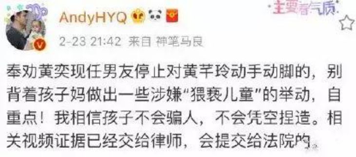 有次更是直接爆料黄奕现任男友背着黄奕骚扰他和黄奕的女儿,还说他已经将相关视频证据交给律师了。