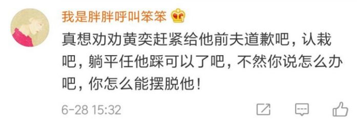 就连网友都劝黄奕快快举旗头降:“真想劝劝黄奕赶紧给她前夫道歉吧,认栽吧,躺平任他踩可以了吧,不然你说怎么办吧,你怎么能摆脱他!”