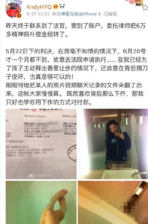 撕逼的原因是黄奕到法院申请执行赔偿精神补偿金,黄毅清认为她是故意去法院申请执行的。为了泄愤报复晒出前妻的私密照片,尺度之大,让人震惊。