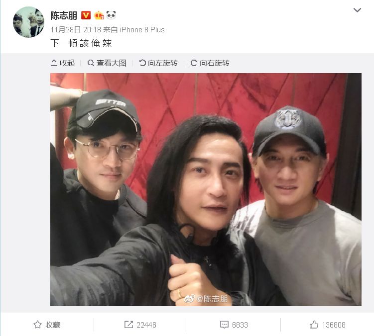 仅隔一夜,陈志朋便晒出三只虎的最新合影,想是吴奇隆特意赶来。