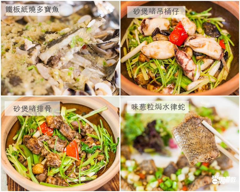 还有铁板纸烧多宝鱼、砂煲啫吊桶仔、砂煲啫排骨、味葱粒焗水律蛇!