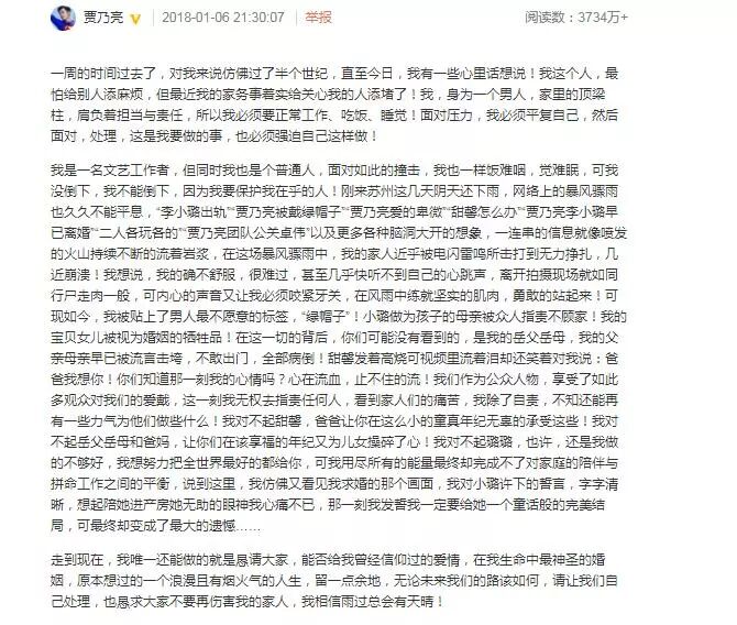 贾乃亮方,自我认错,打亲情牌,暗示离婚;