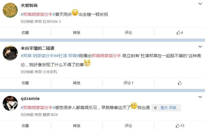 郑爽的粉丝都是喜大普奔的样子,就差开香槟庆祝了。毕竟在他们心中,胡彦斌是配不上小爽的。