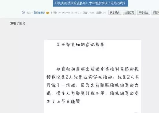 还有些脑洞大得突破天际的网友,表示郑爽和胡彦斌在一起本来就是演戏,目的是给张翰转移火力,因为郑爽实在太爱张翰,而张翰又来威胁郑爽……所以张翰这前男友的戏码什么时候能完结?