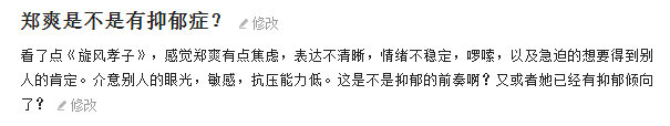 反正《旋风孝子》播出后,以及有不少人在担心郑爽是不是得抑郁症了。
