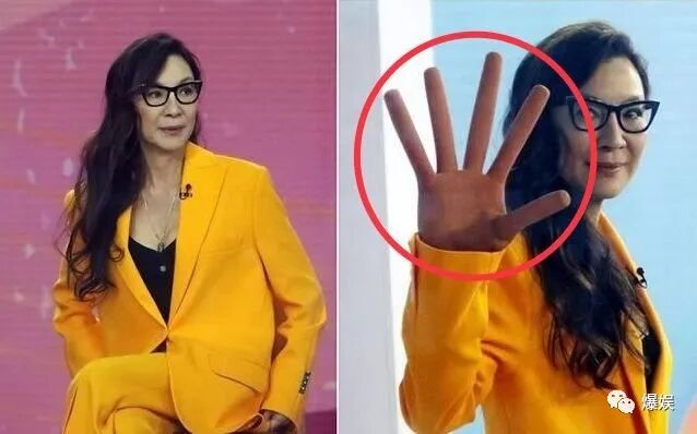 而有张媒体拍到杨紫琼伸手向媒体打招呼的照片,杨紫琼的手被拍得像木偶一样。只见照片中杨紫琼的手指又长又直,都看不到关节了,不知道是媒体P了图,还是用了什么特效。特别是大拇指、食指和小指这三根手指、看上去都不像是人手了,像是什么卡通片中人物的手指。