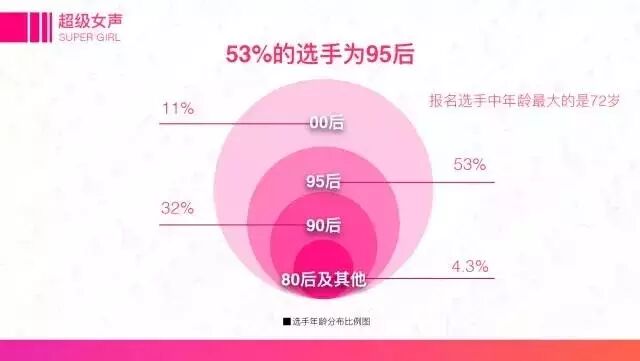 如果说十年前的超女最吸引的是85后女生,那95后的浪潮绝对是2016超女不可忽视的热点,因为高达53%的选手是90后!