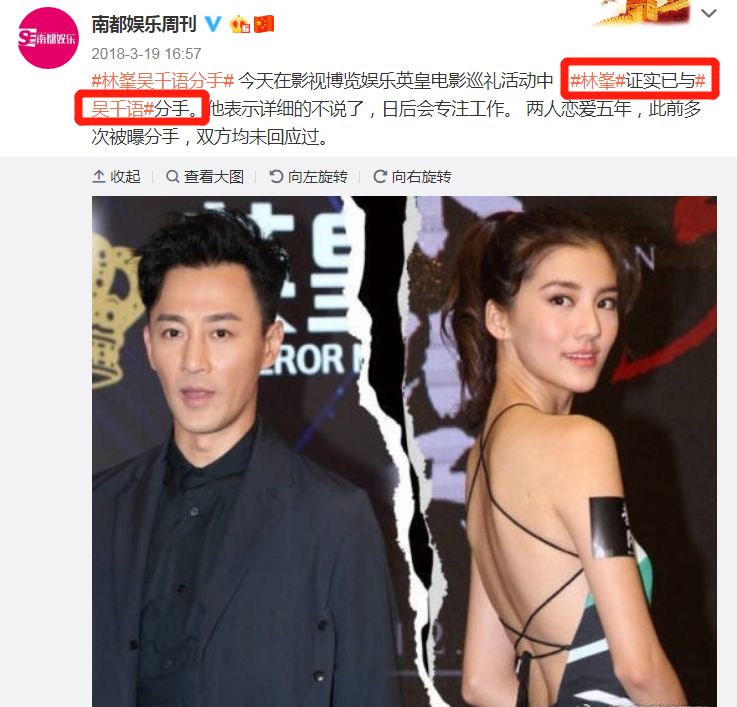 当时大家都以为,林峯一定会跟吴千语修成正果,但可惜,去年三月他们还是分手收场。