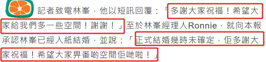 结婚的事,林峯在圈内都没提前公开,当媒体询问其圈中好兄弟吴卓羲、黄宗泽时,他们显然都不知情,不仅相当惊讶,还连连追问是不是真的?