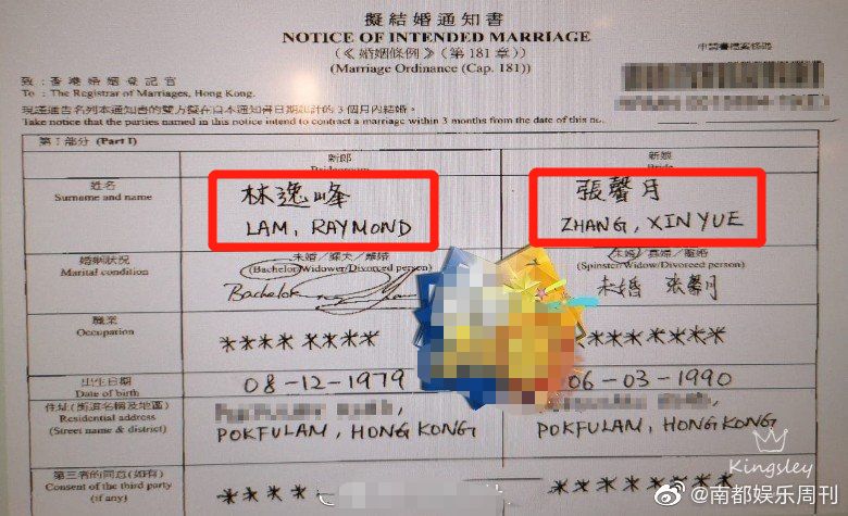 结婚证书也被港媒扒出来,林峯是用本名“林逸峰”登记的。