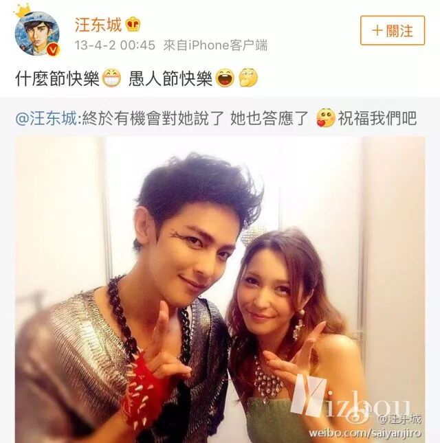 接着又有福尔摩斯扒出过,早在13年4月1日的时候,汪东城确实发过俩人的合影,而且当时的配文是“终于有机会对她说了,她也答应了,祝福我们吧”,但在第二天又转发辟谣说是愚人节。