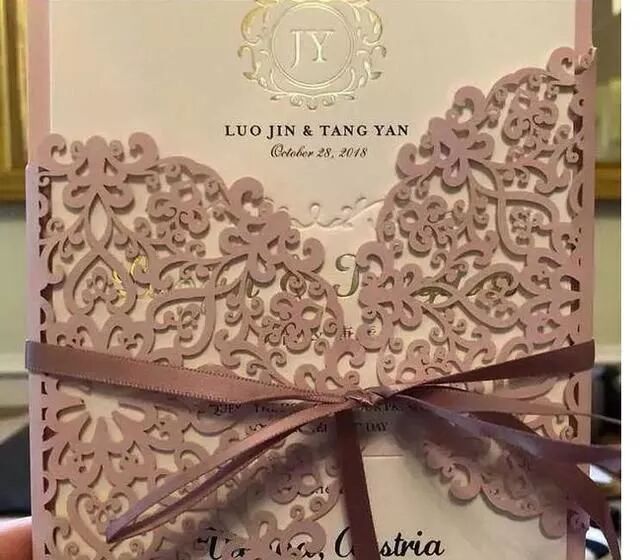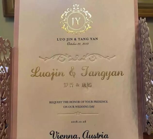 有婚礼嘉宾曝光唐嫣罗晋的婚礼请柬,粉色系的请柬上正中间用烫金文字印着两个人的名字,其余文字以英文为主。