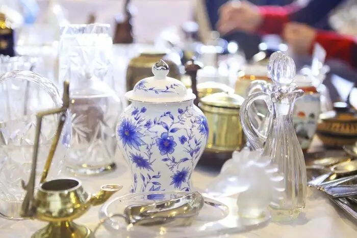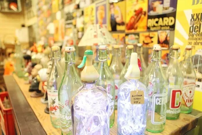 跳蚤市场的二楼,有一家店有很多二手的玻璃瓶和玩具车,
