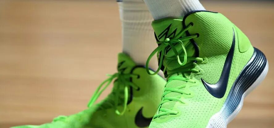 年轻人就应该是朝气蓬勃的,就像本赛季唐斯曾经上脚的那双大面积绿色覆盖的Hyperdunk 2017。看到鞋舌上的那个标记了吗?这个闪电形的PE Logo,即是唐斯的背号32,又是他名字的缩写。
