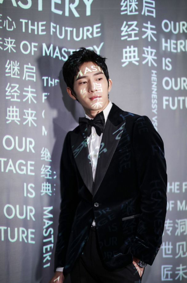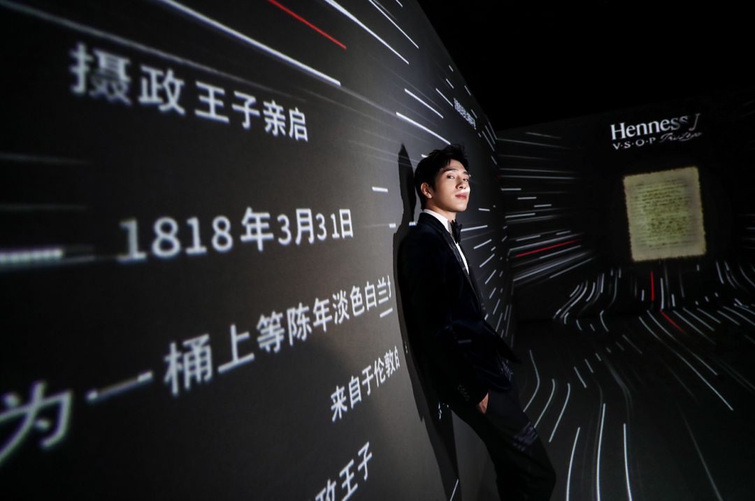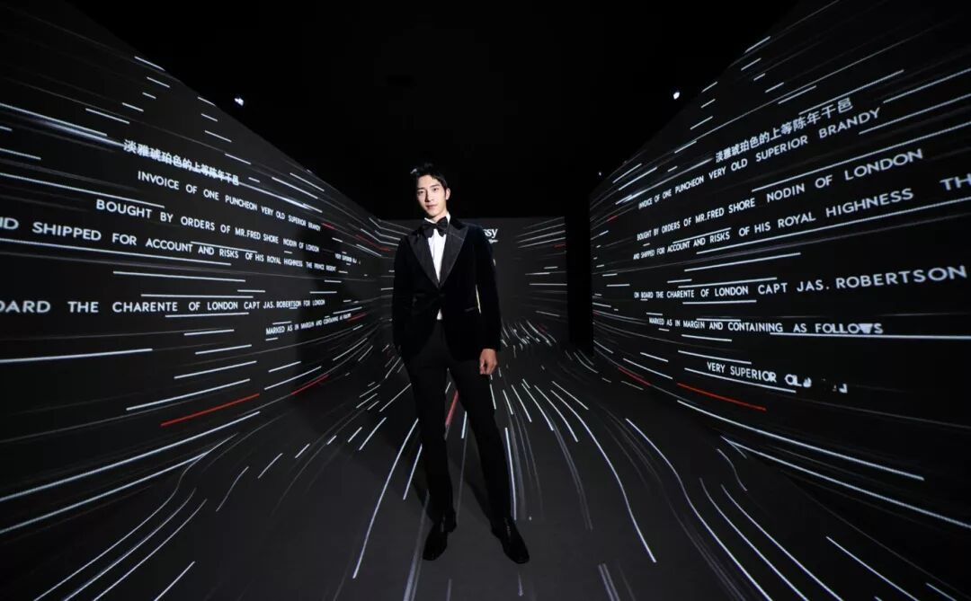活动当晚,他身穿一席黑色丝绒礼服,成熟又不失风度,穿过轩尼诗V.S.O.P品牌“时光隧道”进入会场。