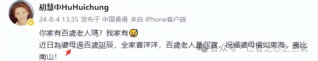 8月4日下午,66岁的资深女星胡慧中(霸王花)在社交网络上更新了一则动态。她写道:“你家里有百岁老人吗?我家有。”并透露最近为婆母(婆婆)庆祝了百岁寿辰,全家都洋溢着欢乐。她还表示“家有一老,如有一宝”,并祝愿婆婆“福如东海,寿比南山”。