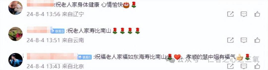 在评论区里,众多粉丝纷纷送上祝福:“祝老人家身体健康,寿比南山”,“祝奶奶福如东海、心情愉快,孝顺的慧中姐有福气!”