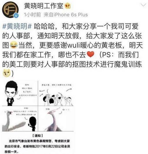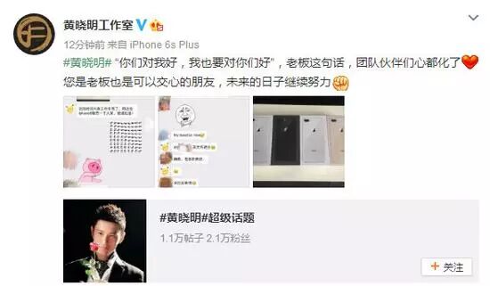 今年9月,黄晓明工作室的人员在微博爆料黄晓明送给员工每人一个iPhone8,还深情表示:你们对我好,我也要对你们好!