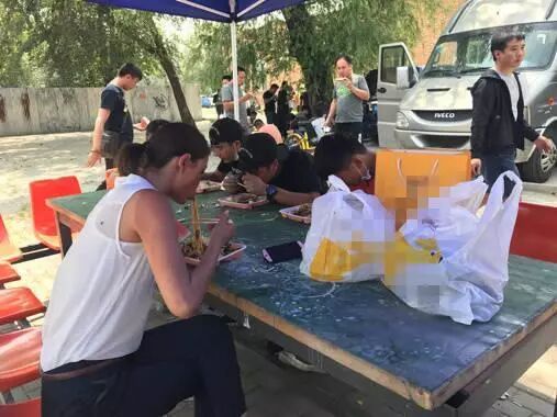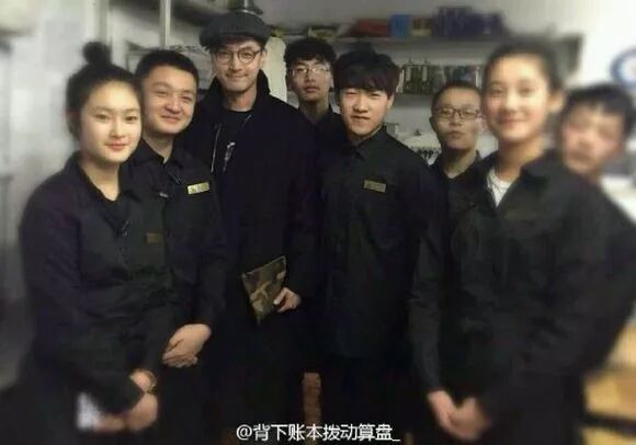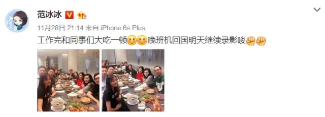 正好前一阵子范冰冰发了两张跟工作人员一起吃饭的照片,范冰冰跟一群工作人员围桌在两个长桌子前,一桌子美味佳肴,其乐融融。
