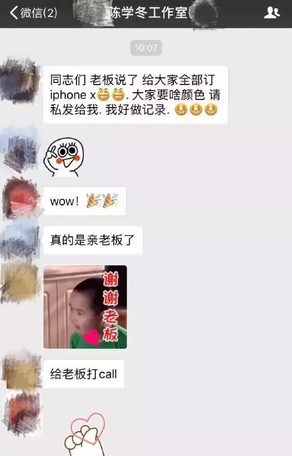 除了黄boss外,陈学冬在iPhone新品出来的第一时间,就在工作群中统计员工都要什么颜色的IphoneX。