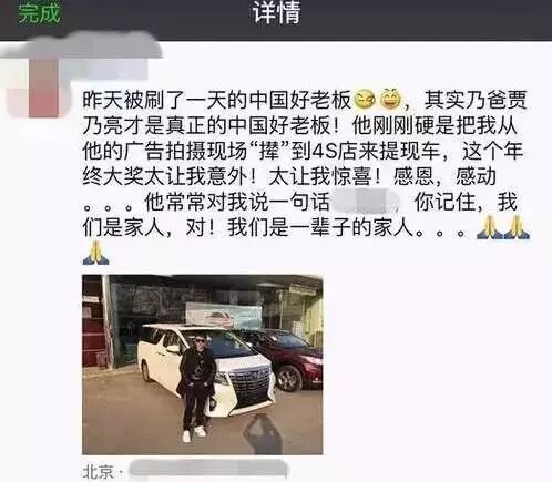 激动得收到豪车的经纪人Miss赵在朋友圈立帖明志,说“无以为报只能爱你”。