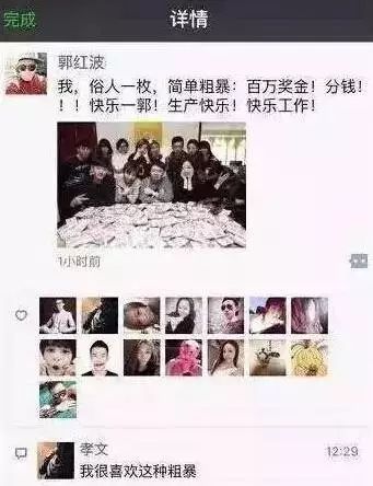 去年他的经纪人,就曾经在朋友圈晒出他们工作室的年底百万福利,白花花的毛爷爷就那么铺了一桌子。简单粗暴!