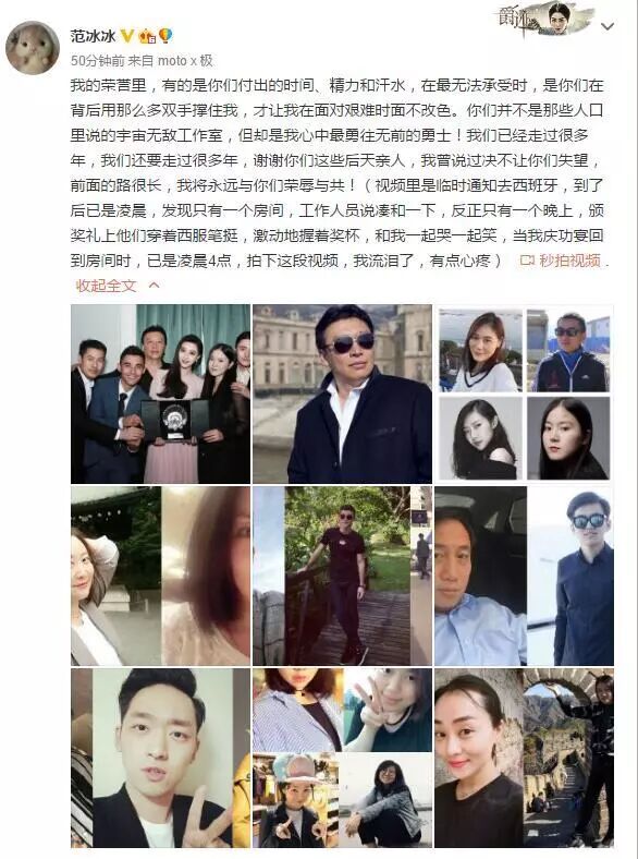 凭借《我不是潘金莲》获得圣塞巴斯蒂安电影节“最佳女主角”银贝壳大奖时,范冰冰特地发长文感谢一直在背后支持她的团队,表示: