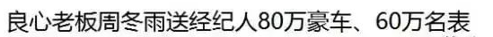 去年就给经纪人送出了80万豪车作为生日礼物,而这位经纪人才带她不到2年,前任经纪人也曾收到周冬雨送的价值60万的名表。