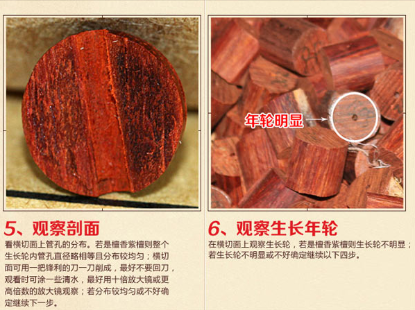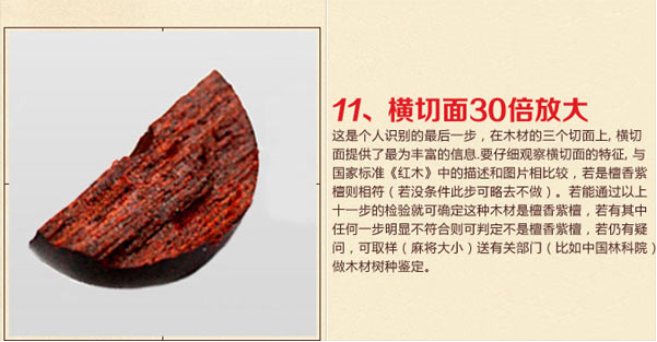 这是个人识别的最后一步,在木材的三个切面上,横切面提供了最为丰富的信息,要仔细观察横切面的特征,与国家标准《红木》中的描述和图片相比较,若是檀香紫檀则相符(若没条件此步可略去不做)。若能通过以上十一步的检验就可确定这种木材是檀香紫檀,若有其中任何一步明显不符合则可判定不是檀香紫檀,若仍有疑问,可取样(麻将大小)送有关部门(比如中国林科院)做木材树种鉴定。