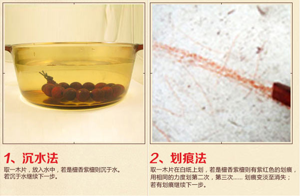取一木片在白纸上划,若是檀香紫檀则有紫红色的划痕,用相同的力度划第二次,第三次……,划痕变淡至消失;若有划痕继续下一步。