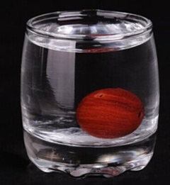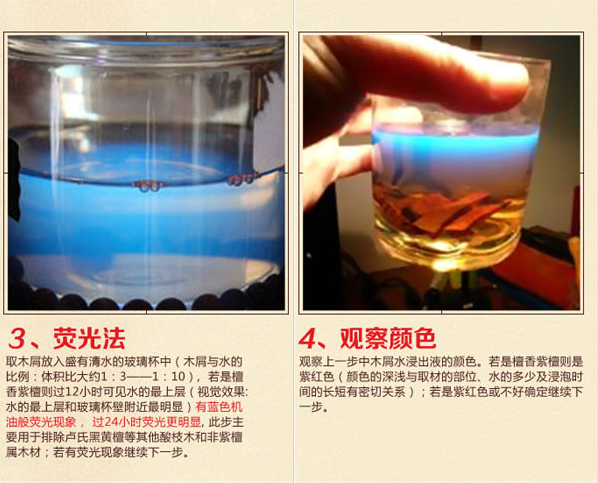 取木屑放入盛有清水的玻璃杯中(木屑与水的比例:体积比大约1:3——1:10),若是檀香紫檀则过12小时可见水的最上层(视觉效果:水的最上层和玻璃杯壁附近最明显)有蓝色机油般荧光现象,过24小时荧光更明显,此步主要用于排除卢氏黑黄檀等其他酸枝木和非紫檀属木材;若有荧光现象继续下一步。