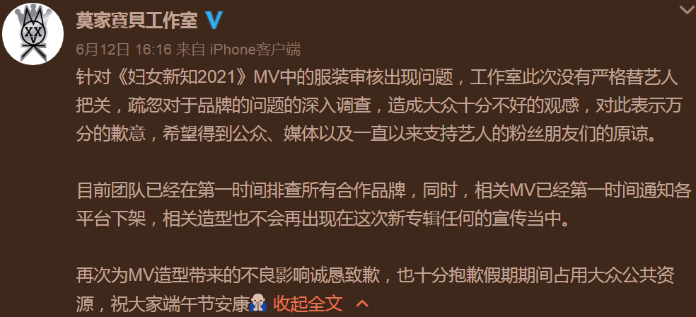 声明还表示:“工作室疏忽对于品牌的问题的深入调查”。另外,工作室已经通知各平台对相关MV进行下架处理。