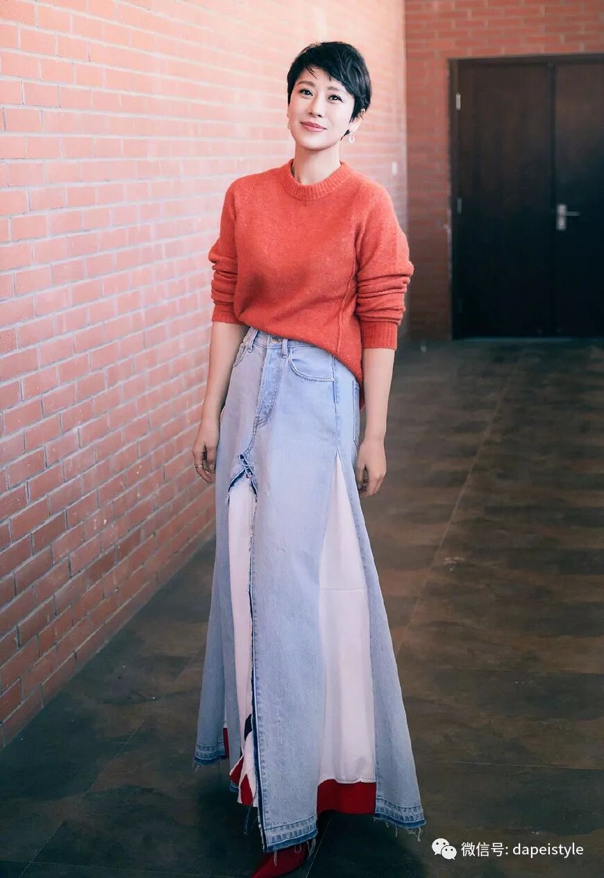 牛仔半身裙的厚重只用点拼接小技巧就被海清完美解决了,还把层次和撞色集于一身,创意我得给个一百昏。上身枫叶橘色针织衫点亮全身,整套造型时髦又有趣。