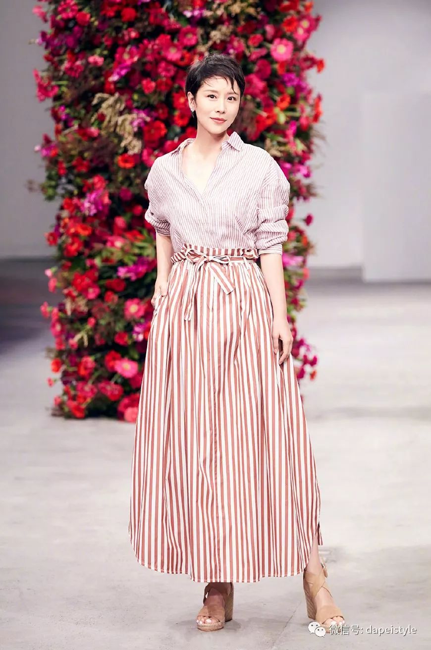 Weekend Max Mara 2018春夏季发布会上,海清选择了一件藕粉色条纹半身裙,挺阔的版型配上微敞的衬衫倒是相得益彰;清新的撞色条纹从上蔓延到下,挽袖口、系腰带的细节统统都有展示,既减了龄,还丝毫没有装嫩的嫌疑。