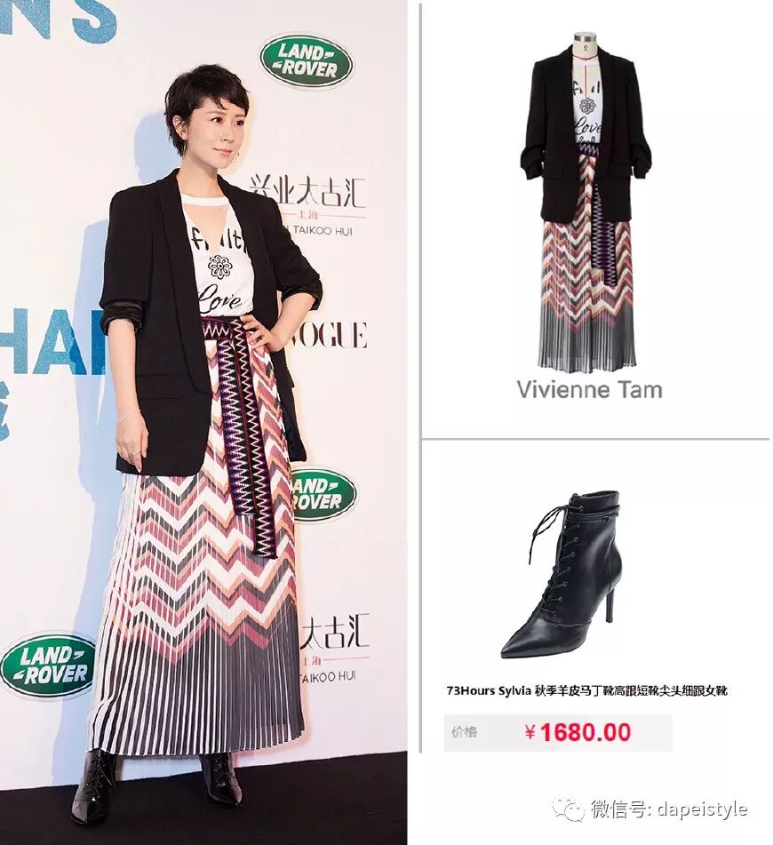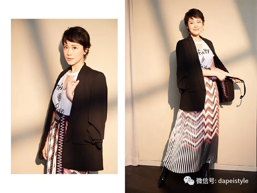 那么具体有多精彩呢,一身服装都来自Vivienne Tam算不算,也是演绎了一波完美的买家秀。黑色西装和裙子的混搭既沉稳又不失俏皮,西装正不正经不知道,反正看下搭的印花半身裙,就能添上不少活泼的感觉;腰上同是撞色锯齿的印花腰带点亮全身,松松垮垮的在腰上分割身材比例,踩上黑色小短靴,整个人又酷又清新,总之特别好看就对了~