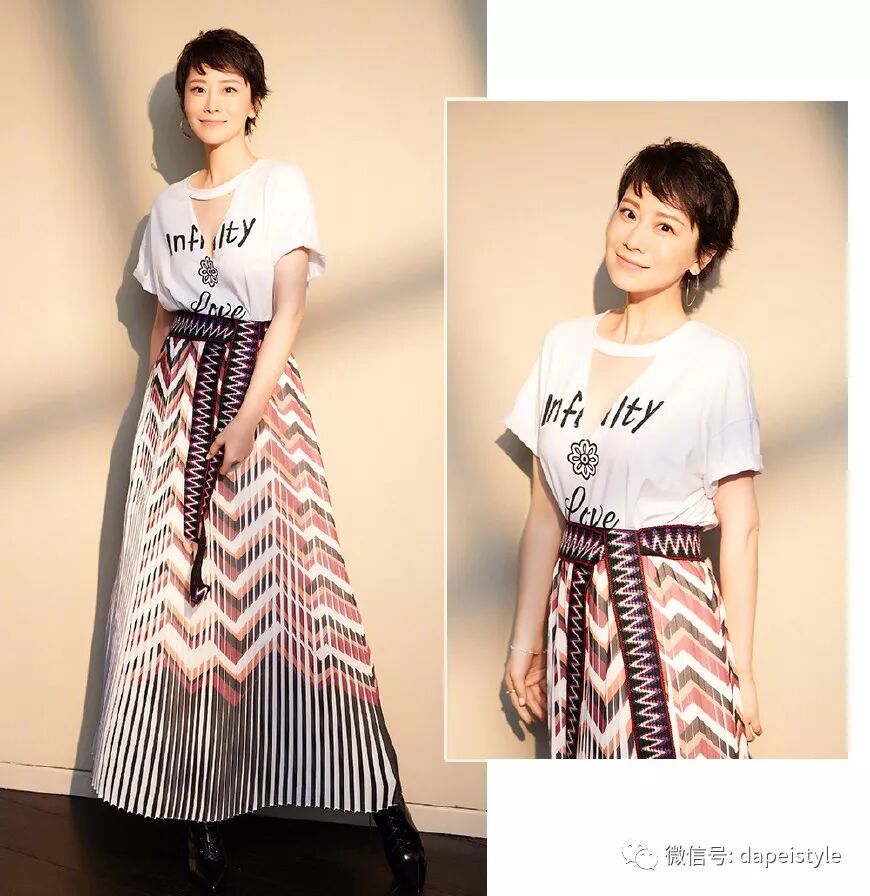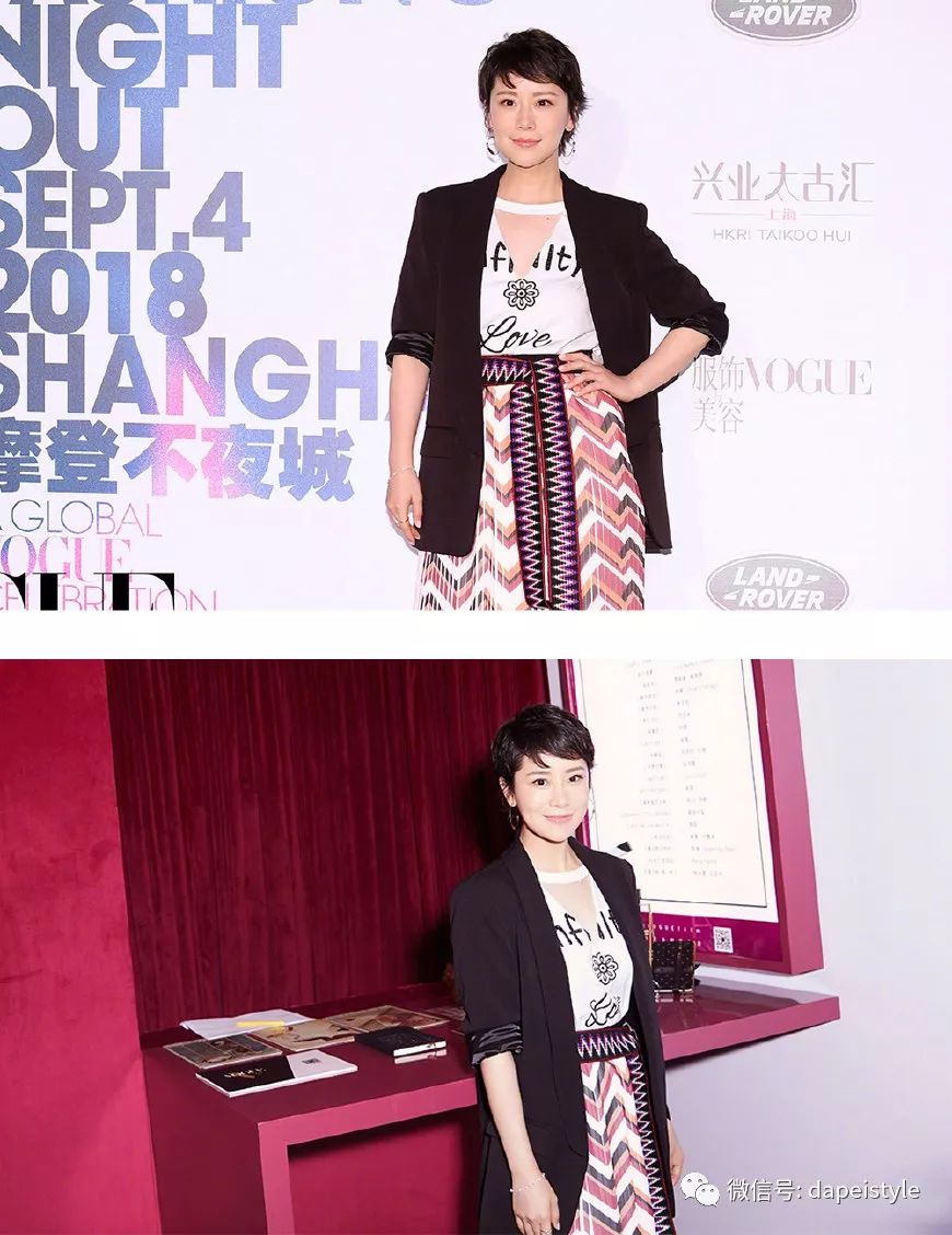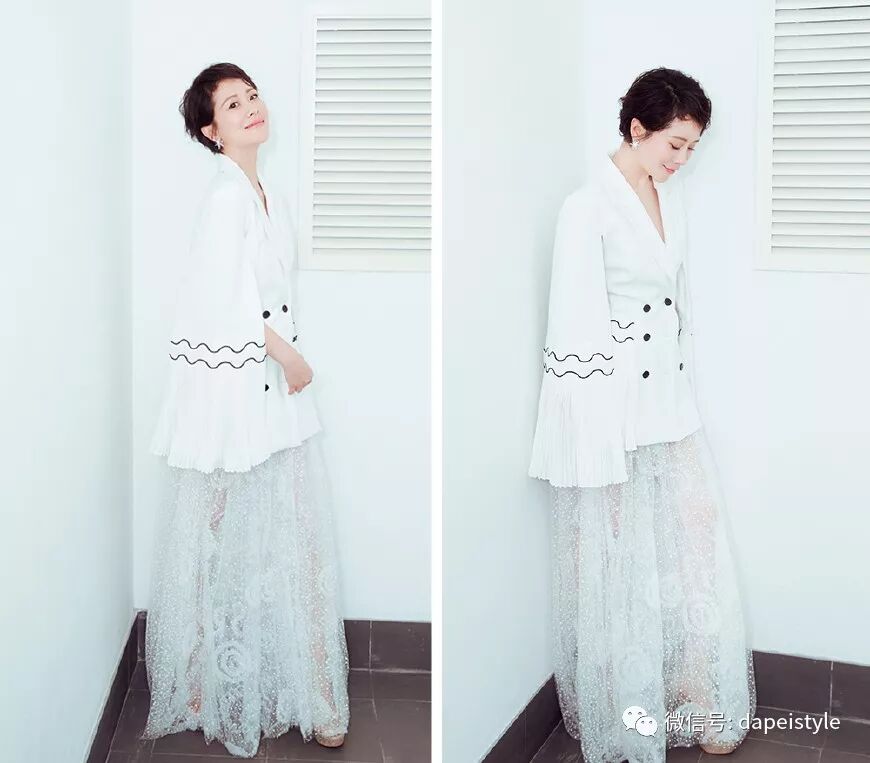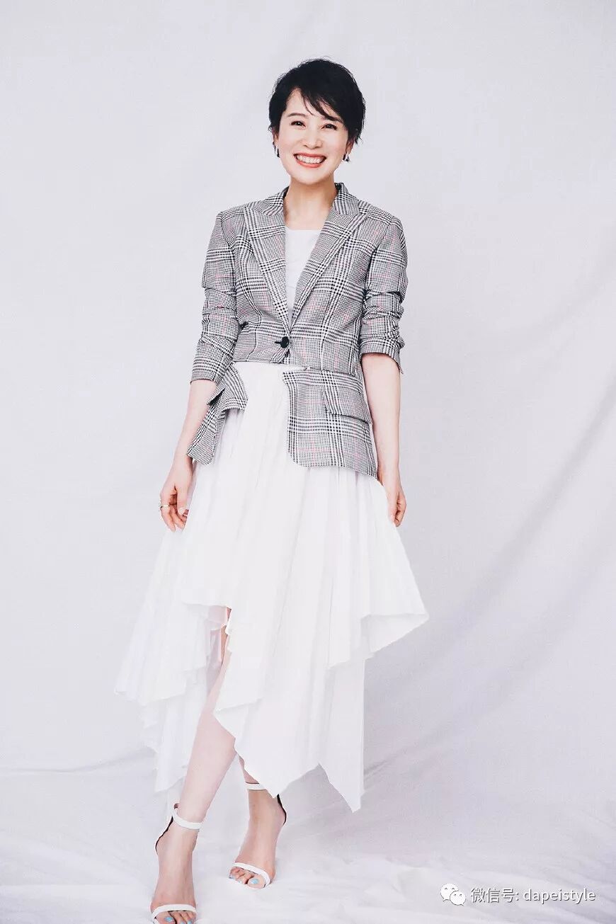 同样白色的还有她参加品牌活动时穿的这件不规则小裙子,随意的线条打破视觉平衡,虽说能逼死强迫症,不过修饰腿型的效果倒是一流,配上小西装,真心看不出40岁。
