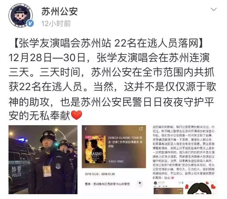12月28日~30日,在张学友苏州演唱会期间,江苏苏州警方共抓获22名在逃人员。