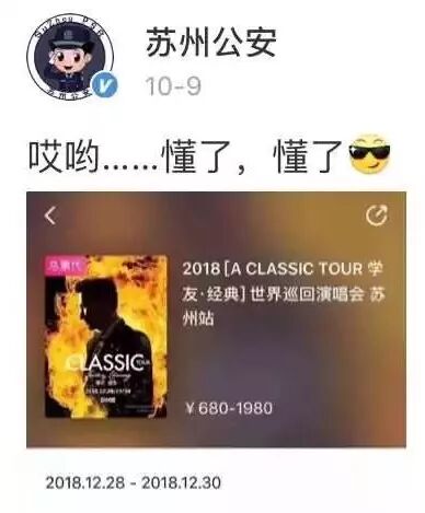 早在2个月前,歌神来苏州开唱的消息一出,苏州警方就立刻表示:“懂了,懂了”。
