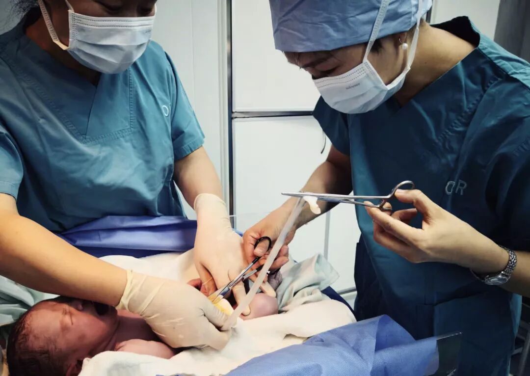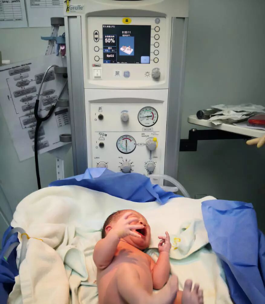 这张照片中宝宝已经出肚,两位医生正在剪脐带。这一幕想必很多当了妈妈的女人都很熟悉,是辛苦又兴奋啊。