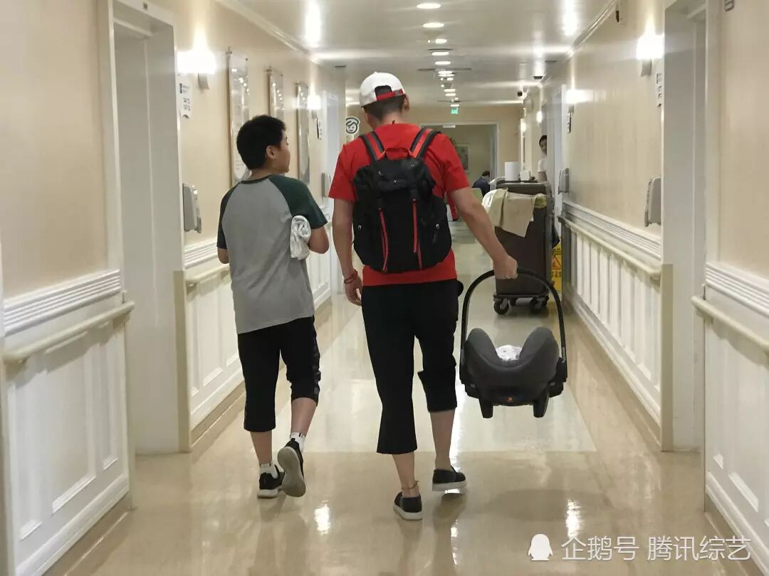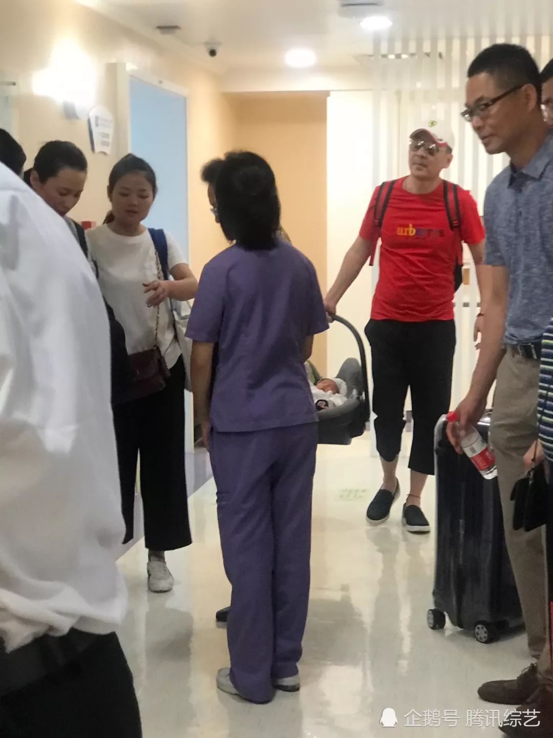 陈建斌和大儿子小老虎一起接蒋勤勤出院。