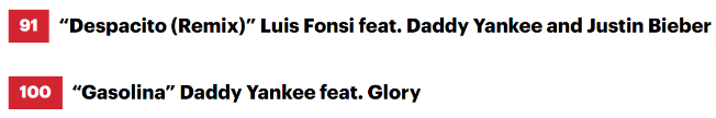 El puesto 91 es para el artista puertorriqueño Luis Fonsi con su tema de 2017, que también contó con la colaboración de Yankee y Justin Bieber, en su versión inglesa. Gasolina, por su parte, se posiciona en el número 100, cerrando la lista.
