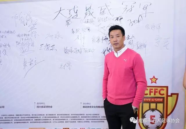 五哥特地为冠军的获得者大连晟威足球队送上了“冠军”字画