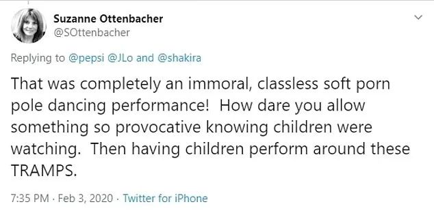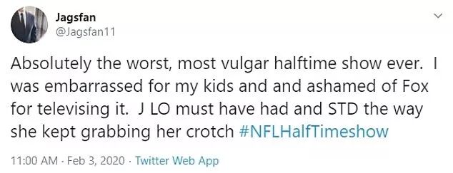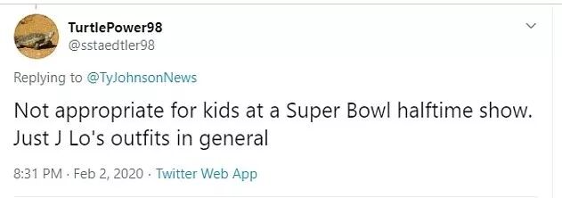 “这次的超级碗中场秀少儿不宜。仅仅从詹妮佛·洛佩兹的服饰就能看出来”,一位网友说道。