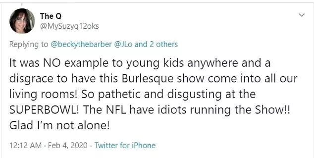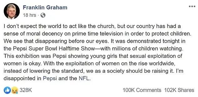 “这对任何地方的孩子都起不到示范作用。在我们的客厅里看这样的滑稽娱乐秀兼职让人蒙羞!能在超级碗表演更是可悲又恶心!NFL让一帮睿智组织了这场秀。庆幸不是我一个人这样觉得!”,一位网友写道。